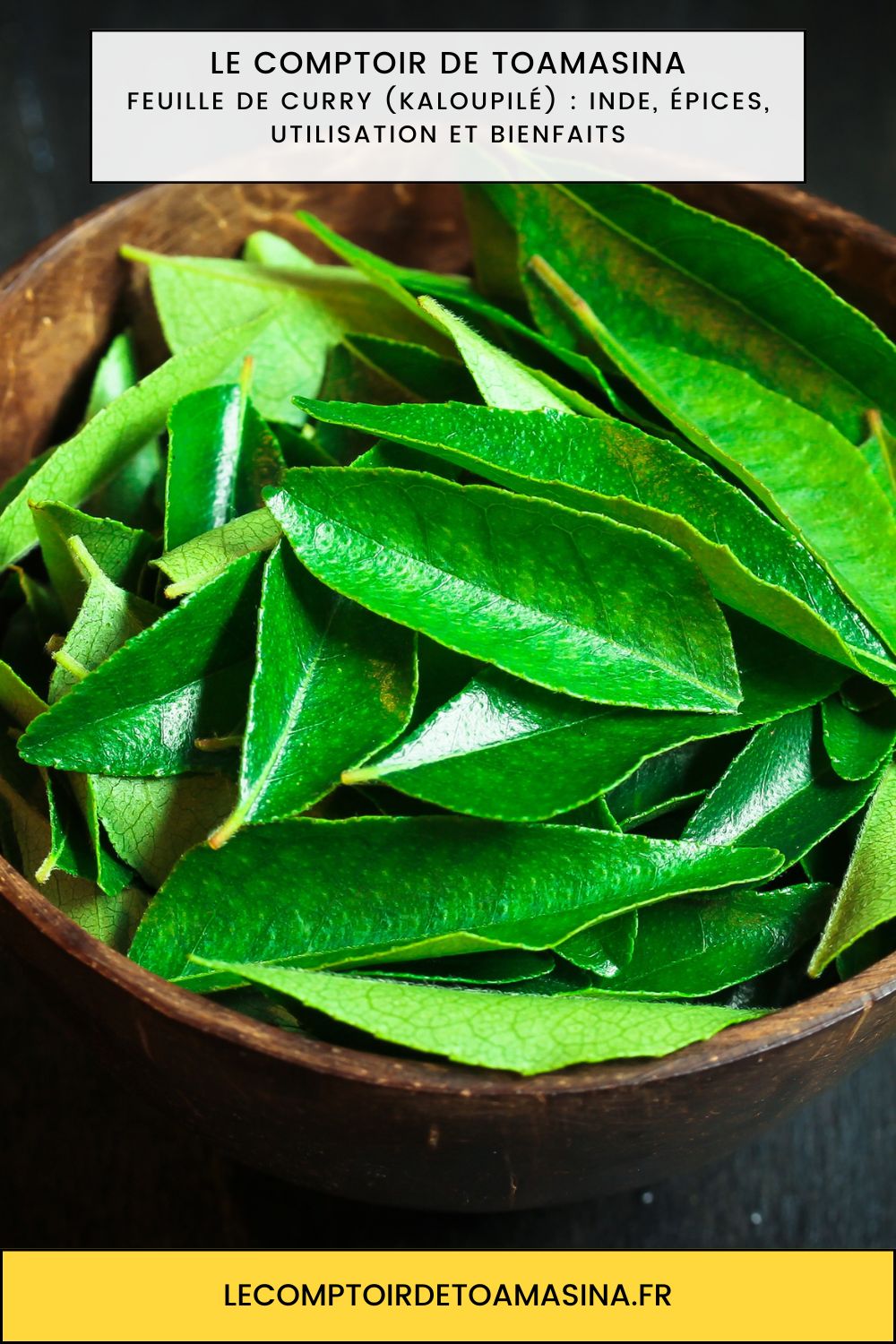 Identité : La feuille de curry (ou kaloupilé) est une herbe aromatique fraîche, à ne surtout pas confondre avec le mélange d’épices appelé curry en poudre.